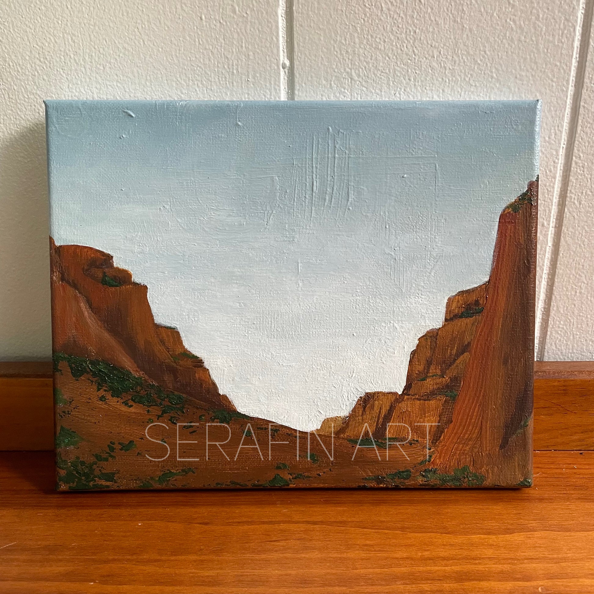 An imagined desert landscape on textured canvas surface with raw brush strokes. Edges of the canvas are painted in similar continuing tones to those on the front.